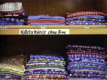 Insgesamt habe sich die Berufskleidung während der ganzen Jahre schon sehr stark verändert. Richtig modisch sei sie geworden. So gebe es heute nicht nur weiße Kochjacken, sondern auch graue oder schwarze. Allein die Knopfauswahl sei schon unwahrscheinlich. Von lachenden Gesichtern bis zur Nudel sei alles vorhanden. „Es gibt sogar welche in Form von Hummern, aber die möchte ich nicht zumachen müssen. Das ist ein ganz schönes Gefutzel“, sagt Frau Kolb. Dafür seien sie aber sehr hübsch anzusehen. Neben der Berufskleidung gibt es bei Schambach auch noch Socken, Schlafanzüge, Feinrippunterhemden, Nachthemden, Nachtschuhe und gehäkelte Bettjäckchen, damit frau sich nicht den Charakter erkältet, wie es so schön heißt. Selbstverständlich führt man hier auch Damenunterwäsche, „aber elegant, nicht so altbacken, sondern mit Spitze“, unterstreicht Margot Glaser. Und auch Kittelschürzen bekommt man hier noch: geblümt, gestreift, uni, mit oder ohne Arm. Obwohl, so Christa Kolb, die Nachfrage hier in den vergangenen Jahren zurückgegangen sei. Dabei seien sie so praktisch, gerade im Sommer. Und so einfach durchzuwaschen. Wirklich praktisch! Aber die Mode ändere sich eben. Und manches komme ja auch wieder. So wie die Vorliebe einiger Architekten für die 1950er-Jahre, wie man am neuen Einkaufszentrum MyZeil sehen könne. Bei Schambach sei die Einrichtung noch original.