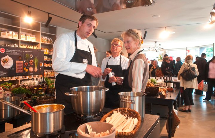 Die Kochhaus-Leute bereiten täglich neue Schiefertafeln mit Rezepten und Dosierungsanleitungen vor und stellen die benötigten Zutaten direkt davor zum Mitnehmen bereit. Inklusive Liveberatung zur Zubereitung und Kochanleitung zum Mitnehmen.