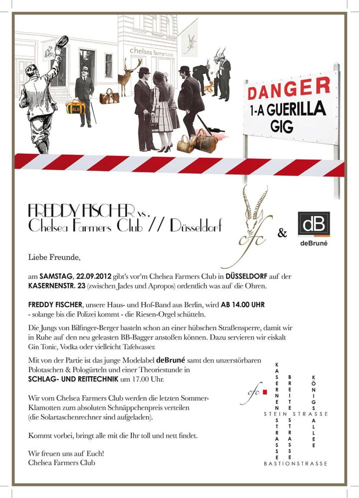 Der wunderbare Chelsea Farmers Club in Düsseldorf lädt ein: Zum Guerilla Gig mit den Berliner Musikern von Freddy Fischer, ab 14 Uhr vor dem Laden in der Kasernenstr. – „bis die Polizei kommt“. Es gibt Gin, Vodka, Wasser und Sommerschnäppchen. Also hin!