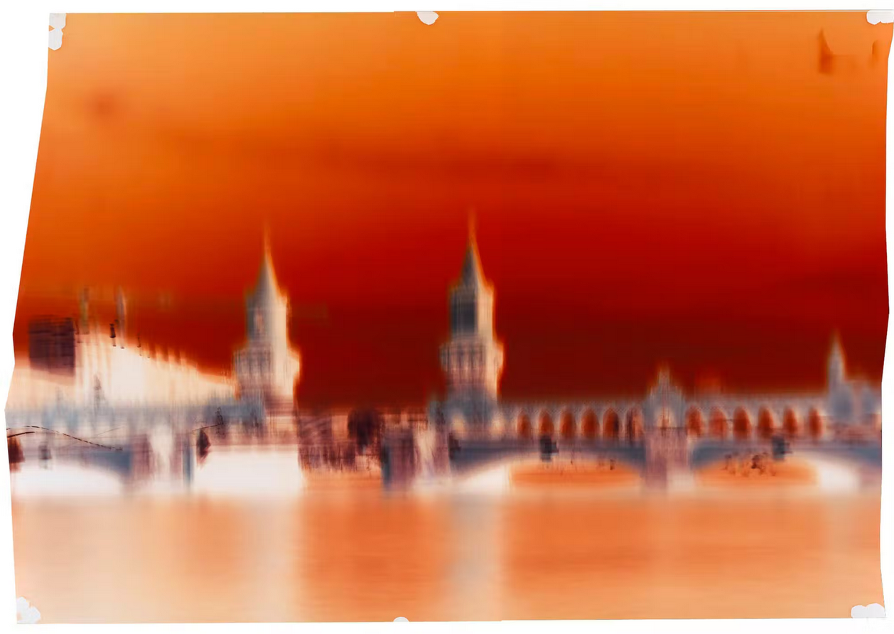 Der Künstler-Captain fährt das Boot in die gewünschte Position, steht dabei außerhalb des Studios in seinem Führerstand am Bug des Bootes. Er sieht also nicht genau, was die Linse der Kamera (und wir im Inneren) sehen. Er löst die Belichtung von dort per Fernauslöser nach Gefühl aus, ohne den Bildausschnitt genau auszurichten, nur ein paar Sekunden lang. Dann ist das Werk getan, ein Foto-Unikat ist im Kasten. Wir hören, wie Maciej auf der Spree rangiert und eilig das Boot anlegt. Wir nehmen wahr, dass er sich, ohne Lichteinfall zu verursachen, zu uns ins Studio windet und in vollkommener Dunkelheit das belichtetete Fotopapier in einer Rolle sichert. Ob die Aufnahme gelungen ist, ob das Licht passte, ob der fokussierte Ausschnitt des Motivs wirklich genau getroffen wurde – all das sieht Maciej erst später im Entwicklungslabor. Das ist sein Konzept, das Resultat wird immer bleiben, wie es geschaffen wurde: vollkommen analog, bewusst vage, aus Überzeugung unbearbeitet – und (konsequent gnadenlos in digitalen Zeiten) ein Einzelstück. Keine Vervielfältigung, keine künstlich geschaffenen „limited editions“ für einen skalierbaren Kunstmarkt. Es geht Maciej um eine Momentaufnahme, eine andere Sicht auf die schnelle Welt da draußen, gleich einem sonst nicht wahrgenommenen Wimpernschlag. Zu diesem Umdenken lädt er Interessierte ein, auf die Spree mitten in Berlin.